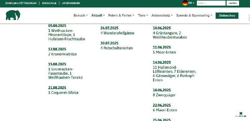 | cajun: | Nachzuchten Oktober 2025: Weißnacken- Moorantilope, Straußwachtel, Kurzschopftaube, vier Borneo- Taubwarane, Ringelschwanzmungo Nachzuchten November 2025: Zweifingerfaultier, Kurzschopftaube, Java Banteng, zwei Kraus- Kopfarassaris Quelle:https://koelnerzoo.de/aktuell P.S. Der Elefantennachwuchs ist für die nächsten Wochen angekündigt. (27.11.2025, 13:30) | ||