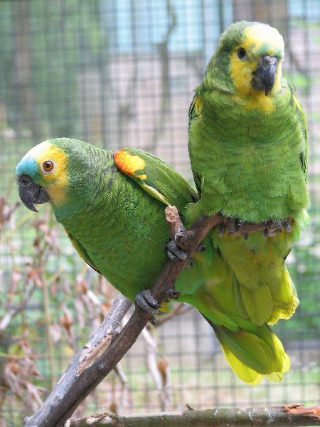 | Tierpark Chemnitz: | Nachwuchs im Papageienhaus Zur großen Freude der Tierparkmitarbeiter gab es dieses Jahr dreifachen Nachwuchs im Papageienhaus. Papageienjunge sind so genannten Nesthocker und anfangs vollkommen nackt, blind und hilflos. Sie halten sich in der Bruthöhle bzw. im Nestkasten auf und werden relativ lange von beiden Eltern versorgt. Daher liegen Schlupftermin und der Zeitpunkt, wo man die Tiere das erste Mal zu Gesicht bekommt, einige Wochen auseinander. Der Nachwuchs bei den Blaustirnamazonen, ein im Mai geschlüpftes Einzelkind, hat gestern den Nestkasten verlassen und ist schon im Außengehege zu sehen. Er lässt sich im Moment noch gut von den Elterntieren unterscheiden, denn ihm fehlt z. B. noch die blaue Stirnfärbung, und seine Iris ist dunkler als bei den erwachsenen Tieren (siehe Foto, Jungtier rechts). Bei dieser Art ist es der erste Zuchterfolg im Chemnitzer Tierpark. Bei den Grünflügelaras schlüpften zwei Jungvögel im Juni aus den Eiern. Sie sind schon recht proper und beginnen gerade, die ersten Schwung- und Schwanzfedern zu schieben. Sie hocken noch im Kasten im Innengehege. Hier gelang die Nachzucht im Tierpark im vergangenen Jahr zum ersten Mal, damals war es nur ein Jungtier. (25.07.2008, 15:42) | ||