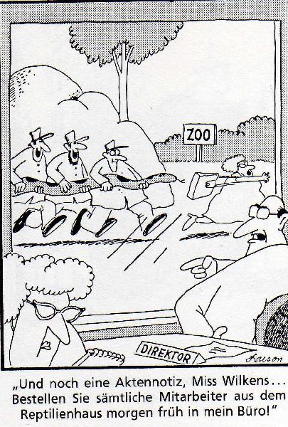 | Michael Amend: | Hier die längst überfällige " Wiederbelebung" des verschollenen Satire-Threads. Ich mache den Anfang mit Gary Larson, dessen unübertroffener Humor jedem Zoo,-und Tierfreund geläufig sein sollte... (11.01.2008, 19:06) | ||