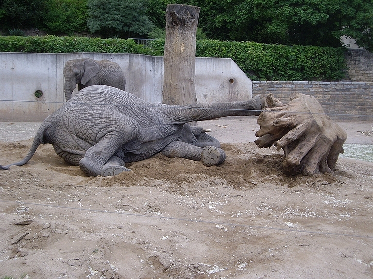 | Gudrun Koball: | Ende Mai beobachtete ich in Erfurt, wie Seronga sich neben diesem alten Baumstubben hingelegt hatte und, nachdem sie eine ganze Weile geruht hatte, anfing, damit zu "spielen". Sie muss sich den Baumstubben extra mit an ihren Liegeplatz auf einem frischen Sandhaufen mitgenommen haben, da er sonst im Gehege immer an einer anderen Stelle steht. Sie verbrachte so mit Ruhen / Schlafen und Beschätigung etwa eine halbe Stunde in meist liegender Position. (18.08.2009, 09:01) | ||