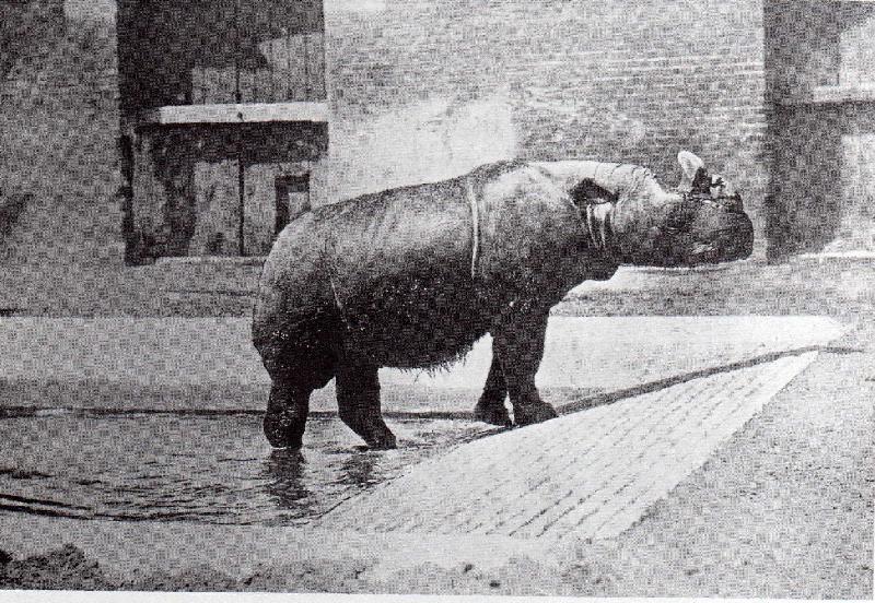 | Michael Amend: | Die Zoo London hat zwei bemerkenswerte Haltungserfolge mit Sumatarnashörnern erzielt. Das erste Tier, die Kuh " Begum", wurde 1868 in der nähe von Bangladesh gefangen und kam vier jahre später, 1872, nach London. Dorts trab sie am 31. August 1900, nach 28 jähriger Haltung im Alter von ca. 33 Jahren. Demnach dürfte sie das wahrscheinlich am längsten in gefangenschaft gehaltene Sumtarnashorn gewesen sein. Das Foto zeigt sie in einem der Außenanlagen des Dickhäuterhauses. Immerhin gab es darin ein recht großes Badebecken und eine Schlammsuhle, die heutzutage immer noch in den meisten Nashorn-Anlagen in unseren Zoos fehlen.... Das Foto stammt aus dem Buch " London Zoo from old photographs 1852-1914" (18.09.2008, 18:14) | ||