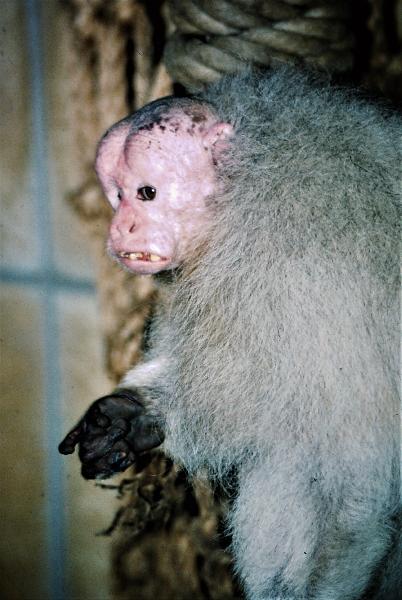 | W. Dreier: | Auch die Uakaris sind schon lange nicht mehr existent. 1990 gab es 3 Formen (z. T. in Einzelexemplaren) in Köln. Hier ein weißer Uakari - wegen der Gesichtsdeformation ``Glöckner von Notre Dam`` genannt. (20.04.2020, 11:08) | ||
