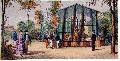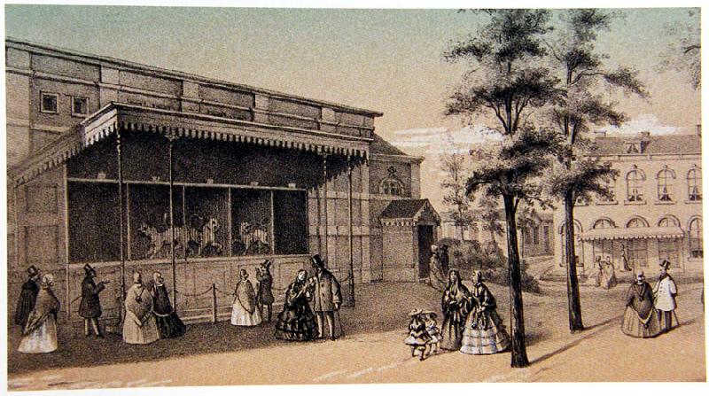 Abbildung aus der Antwerpener Chronik; muss vor 1855 entstanden sein, sonst hätte man den Ägyptischen Tempel mit Sicherheit eingebunden. Oben ist gewissermaßen dessen Vorgänger zu sehen, ein Gebäude für (mindestens) Elefanten und Giraffen, dessen hölzerner Giraffenstall ein wenig an einen Silo erinnert. Unten die Greifvogelgalerie, die größtenteils noch heute existiert (steht allerdings gerade leer und soll restauriert werden). Ihr fehlt heute nur der linke Außenbereich (Endvoliere und Bogengang); in einem Zooplan von 1937 ist die Galerie noch vollständig. (21.10.2008, 09:51)