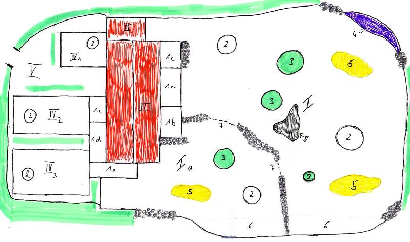 | Henry Merker: | Anbei befindet sich die beschriebene Skizze. Die Skizze ist von mir nicht maßstabsgetreu gezeichnet worden. Legende zur Skizze: Nummer Beschreibung I Außenanlage (groß) für Weibchengruppe Ia Bullenanlage (kann von Weibchenanlage separiert werden) II Stallgebäude III Gebäude für Tierpfleger (Werkzeuge, Pausenraum usw.) IV 1 Bullen- oder Mutter-Kind-Gehege IV 2 Zuchtgehege 1 IV 3 Zuchtgehege 2 V Wirtschaftshof 1a Bullenvorgehege 1b Vorgehege für Bulle oder Kuh 1c Vorgehege 1d Vorgehege (als Verbindung für IV 2 und IV 3 verwendbar) 2 Unterstände (Sonnen- und Regenschutz) 3 umzäunte Bauminseln 4 Wassergraben 5 Sandkuhlen 6 Trocken- oder Wassergraben 7 Durchgang (von I zu Ia und umgekehrt) 8 Schlammsuhle grüne Streifen um der Anlage Hintergrundbepflanzung zur Abschirmung der betreffenden Bereiche grau punktierter Bereiche Felsformationen zur Abschirmung oder Umgrenzung der Außenanlagen (26.07.2009, 11:42) | ||