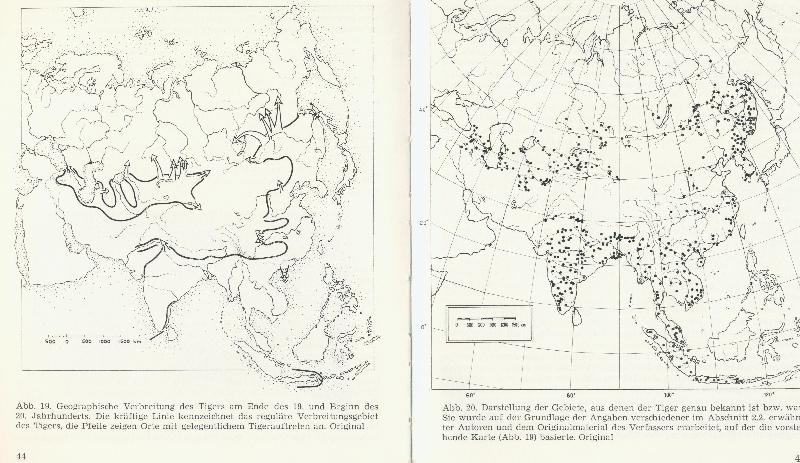 | WolfDrei: | Hier drei Karten aus dem Tiger-Buch der "Neuen Brehm-Hefte": zunächst Belegte Tigerfunde und daraus abgeleitet "Maximalausbreitung". Wichtig ist , daß die Mittelasiaten nicht aus dem indischen Raum einwanderten. (04.02.2011, 10:28) | ||