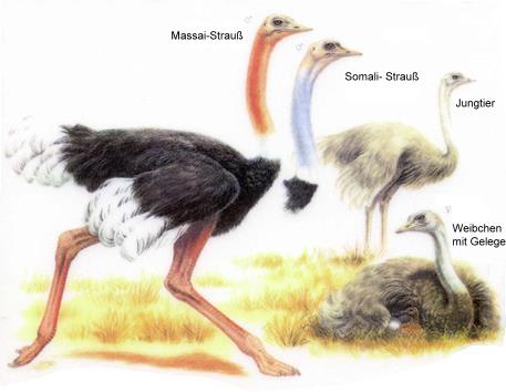 | Alexander Fuchs: | Ich mache diesbezüglich ein neues Thema auf zum Thema Strauß. Habe mal ein wenig gestöbert und man findet kaum etwas zum Thema Strauß und deren Unterarten (Größe, Gewicht), aber einige interrassante Ansätze. So unterscheidet man noch vier rezente Unterarten des Straußes. Die fünfte Unterart ist Struthio camelus syriacus ist wohl 1966 ausgestorben. Der südafrikanische Farmstrauß (Struthio camelus domesticus) ist von einigen auch als eigenständige Unterart anerkannt. Er soll aus dem Südafrinaischen Strauß und dem Nordafrikanischem Strauß heraus gezüchtet sein. Man hat bei Ihnen viel Wert auf die Federqualität gelegt. Die Farmtiere sind kleiner, kompakter und früher geschlechtsreif. Der südafrikanische Farmstrauß zählt zu den Blauhalsstraußen, wird aber häufig als Schwarzhalsstrauß bezeichnet oder auch „African black“ bezeichnet. Bei den Farmstraußen können weitere Zuchtrassen unterschieden werden(Nabian blue neck, Simbabwe blue neck). Der Nabian blue neck und Simbabwe blue neck werden für die Fleischgewinnung und Lederproduktion genutzt und der African black für die Federgewinnung. Allgemein zu den Rothalsstraußen werden der Nordafrikanische Strauß und der Massaistrauß zugeordnet und allgemein als Blauhalsstrauße werden der Somalistrauß, Südafrikanischer Strauß und der Farmstrauß zugeordnet. Leider fand ich nichts zu den Körpergrößen der jeweiligen Unterarten. Im allgemeinen wird von 1,90 m bis 3,00 m berichtet. Ich finde es persönlich schade das es dazu nichts zu finden gibt. Eine kleine Abbildung zum Größenunterschied habe ich dann doch gefunden, da gebe ich doch die Quelle an (http://nandu.na.funpic.de/strauss.htm) (24.07.2010, 10:30) |