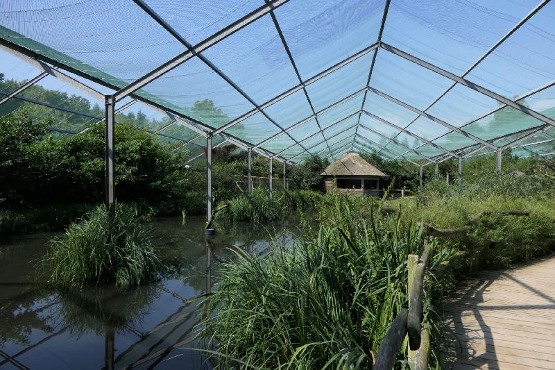 | Gudrun Bardowicks: | Teil 3 Ein Highlight wie immer die begehbare Großvoliere für Vögel und Lebensräume des Nationalparks Vorpommersche Boddenlandschaft mit einem artenreichen Vogelbestand wie beispielsweise Löffelenten und Moorenten mit Jungvögeln und einer großen Anzahl von Lachmöwen und Säbelschnäblern. Leider ließen sich von den dort ebenfalls untergebrachten Kleinvogelarten nur Gimpel mit flüggen Jungvögeln, Goldammern und Stieglitze sehen. Diese Anlage ist mittlerweile größtenteils so stark bewachsen, dass sich der Vogelbesatz hervorragend dem Blick der Besucher entziehen kann. Die ausgeschilderten Zwerggänse (etwas unpassend für die Anlage),Zwergsäger und Rebhühner zeigten sich z.B. nicht. Die Zwerggänse wurden vermutlich mittlerweile aus der Anlage herausgenommen. - Die riesige begehbare Waldrappvoliere, die Beste, die ich in einem Zoo oder Vogelpark kenne, ist aktuell nur noch mit dem Waldrapp besetzt. Ein Unterbesatz aus beispielsweise Trielen würde sie noch zusätzlich beleben. auch hier gab es Jungvögel, die von ihren Eltern aufgezogen wurden. - Die Tropenhalle ist nur noch mit Vögeln besetzt. Ich sah dort Gabelschwanzracken, jerweils einen Trupp Balistare und Rotohrbülbüls, Straußwachteln mit kleinen Küken und älteren Jungtieren, Sonnenrallen, einen männlichen Palawan-Pfaufasan, Reisfinken und mehrere Luzon-Dolchstichtauben, darunter ein Paar mit einem noch sehr kleinen Kükenin der Zuchtvoliere, die in der Vergangenheit auch schon mal Liszt-Äffchen beherbergte. Kois und einige weitere Fische belebten die Teiche, die teilweise ebenfalls Unterwasserscheiben hatten. Auch Gelbwangen- und Rotwangen-Schmuckschildkröten waren vorhanden. Schmetterlinge gibt es keine mehr. Die angrenzende Anlage für Zwergotter wird gerade umgebaut und ist im Augenblick nur mit Hausenten besetzt. Die großen Kranichanlagen waren mit Schneekranichen, Mandschurenkranichen, Weißnackenkranichen und laut Beschilderung auch Graukranichen besetzt. Leider bestehen einige der Anlagen nur aus natürlichen Feuchtwiesen und weisen keinerlei Gewässer auf, während die in der Nähe der Waldrappvoliere liegenden Anlagen mit Bachläufen und teilweisen Waldbeständen sehr naturnah aussehen. - Toll die vielen unterschiedlichen Spielplätze und Übernachtungshütten an strategisch interessanten Punkten wie Kea-Anlage, Lemuren-Anlage und Südamerika-Anlagen. - Der älteste Teil mit den Papageienvolieren fällt gegenüber den anderen Bereichen optisch stark ab. Er ist z.Z. noch mit Chinasittichen in Vergesellschaftung mit Edwardsfasanen, Sonnensittischen in Vergesellschaftung mit Grünflügelaras, Hyazintharas zusammen mit einer Zwergaraform (nicht ausgeschildert, vermutlich Rotbugara oder Hahns Zwergara),Fächerpapageinen und einem Paar Kleiner Soldatenaras besetzt. Hier ist als Ersatz eine riesige begehbare Aravoliere mit Baumwipfelpfad in Planung. (12.07.2016, 14:28) | ||