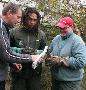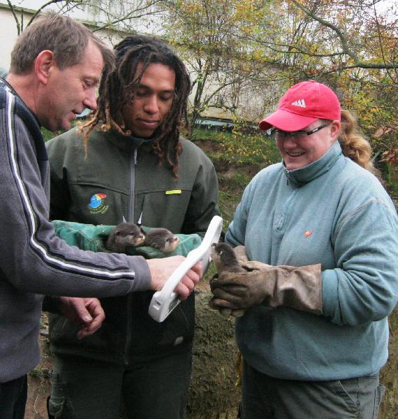 | Vogelpark Marlow: | Reges Treiben bei Familie Otter So hatten sich die Zwergotter das nicht vorgestellt. Erst wurden sie getrennt und dann auch noch gefangen. Aber das alles hatte einen Grund. Ende September erblickten drei Otterbabys das Licht der Vogelparkwelt in Marlow. Sie wurden von der ganzen Familie behütet und verwöhnt. Nicht nur deren Eltern zogen sie auf, auch ihre älteren Geschwister vom vorangegangen Jahr halfen fleißig, damit es den Kleinen an nichts fehlt. Doch nun wurde es an der Zeit die drei Winzlinge tierärztlich untersuchen zu lassen. Früh morgens fanden sich die Tierpfleger zusammen mit dem Tierarzt Dr. Wiedemann im Ottergehege ein. Die drei Kleinen waren schnell gefangen, wurden doch die erwachsenen Tiere kurzzeitig im Otterhaus eingesperrt. Nachdem das Trio gefangen wurde, waren alle aufgeregt wie viel Weibchen und Männchen es wohl in diesem Jahr sind. Wie sich heraus stellte sind es zwei Weibchen und ein Männchen. Damit sie auch in Zukunft unterschieden werden können, sind alle drei mit einem Transponderchip ausgestattet worden. Schnell noch eine Impfung und der ganze Spuk war auch schon vorbei. Zu mindestens die kleinsten hatten es überstanden, aber jetzt waren auch noch die großen dran. Dank der guten Zusammenarbeit zwischen den Tierpflegern und den fachkundigen Blicken von Dr. Wiedemann konnten auch die erwachsenen Zwergotter bald wieder zu ihrem Nachwuchs gelassen werden. Mittlerweile sind die Drillinge so groß, dass ihre Eltern sie auch schon draußen herum laufen lassen. Wer sich diesen Anblick nicht entgehen lassen will, der kann auch in den Wintermonaten den Vogelpark Marlow täglich von 10-15 Uhr besuchen. An dieser Stelle möchte sich der Vogelpark Marlow ganz herzlich bei Dr. Wiedemann bedanken, der zu jeder Tag- und Nachtzeit für die Bewohner des Parks da ist. Auf dem Foto: Die beiden Tierpfleger Marco Böttche und Nicole Sonntag haben die kleinen Otter fest im Griff, somit kann Dr. Wiedemann (links im Bild) testen ob die implantierten Chips auch funktionieren. (16.11.2010, 14:52) | ||