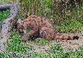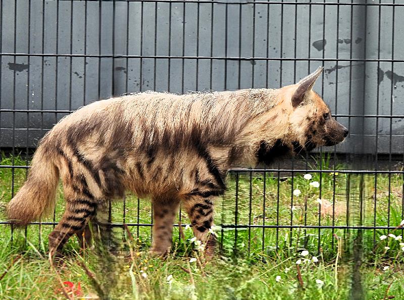 | W. Dreier: | Eintritt nunmehr in der neuen Anlage, beginnend mit Tüpfelhyänen, deren männliches Tier die Unterworfenheit in persona ist, dann Streifenhyänen, ausgedeutet als Berberhyänen, also aus Nordwestafrika, die auch schon Nachwuchs hatten. Und immer Gitterstäbe und stärkerer Draht als Fotohindernis, so die Tiere nicht etwas entfernt stehen. (14.10.2025, 20:58) | ||