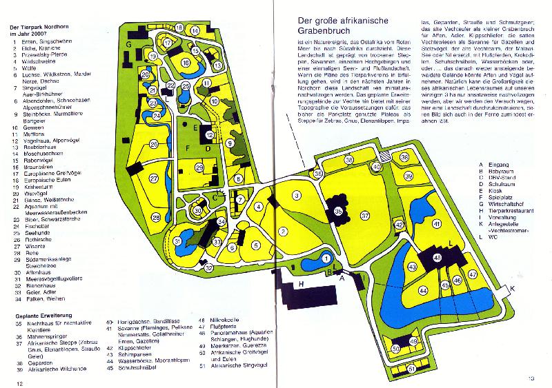 | Michael Mettler: | Kennt ihr eigentlich die Zukunftsvision (eigentlich müsste man sagen: die Träumerei), die der Park in den 80ern veröffentlichte, sogar in einer eigenen Broschüre? Statt des Vechtehofes und seiner Sommerweiden hätte auf der Erweiterungsfläche ein Parkteil Afrika inklusive Nachttierhaus entstehen sollen, und im Vechte-Altarm stellte man sich u.a. Flusspferde und Nilkrokodile (!!) vor... Anbei der damalige Plan für das Jahr 2000. Die Fläche der dort mit 1 bis 6 nummerierten Anlagen gehört heute nicht mehr zum Tierparkgelände, Nr. 7 ist heute die Totenkopfäffchenanlage, Nr. 34 die bewusste Altvoliere. (27.05.2014, 10:17) | ||