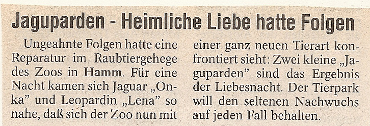 | Carsten Horn: | @Uwe: Siehe den Zeitungsartikel aus der WAZ weiter unten, danach gab es Jaguarpaden. Zeitung schreibt natürlich gelegentlich Unsinn, in dem Fall allerdings anscheinend nicht... War jetzt extra auf dem eiskalten Dachboden, draußen aktuell minus 5,2 Grad, um besagten Jahresbericht zu suchen, von 1995. Auf dem Titelbild sind zwei junge Raubkatzen, ob es junge Ceylonleoparden oder besagte Jaguarpaden sind, wage ich nicht zu entscheiden, dafür fehlt mir der Blick. Die gesamte Seite 3 ist den Jaguarpaden gewidmet, damit dürfte es sie gegeben haben denke ich. An Informationen steht dort, das es wohl das bekannteste Ereignis im Tierpark Hamm 1995 war und sie deshalb das Deckblatt des Jahresberichtes schmücken, daher kommt dann vermutlich in meiner Liste Titelbild Jaguarpade. Zur Geschichte steht dort: Reparaturbedingt waren Jaguar Onca und Leopardin Lena eine Nacht zusammengesperrt. Die Schwangerschaft wurde nicht bemerkt, erst nach der Geburt wurde man aufmerksam. Der Pate gab den beiden Jungtieren die Namen Bonnie und Clyde. An der Zookasse wurden zwei Fotos von Dr. Berding, damals Vorsitzender des Vereins, von den Jungtieren verkauft, eins davon ist abgebildet und noch zwei weitere Bilder der Jungtiere innen. Im eigentlichen Jahresbericht steht dann die Nacht der Zeugung, 27.03.1995, in der Geburtenliste Geburtsdatum 10/1995 und es waren die einzigen Raubkatzen, die in dem Jahr geboren wurden. Wenn der Zoodirektor P. T. Barnum heißen würde, könnte es immer noch ein großer Humbug zu Werbezwecken sein, aber da nicht der Fall, würde ich vermuten, es gab die Jaguarpaden... Ist der einzige Jahresbericht, den ich habe, in welchem Zeitraum sie erschienen, kann ich nicht sagen... (13.12.2022, 09:14) | ||