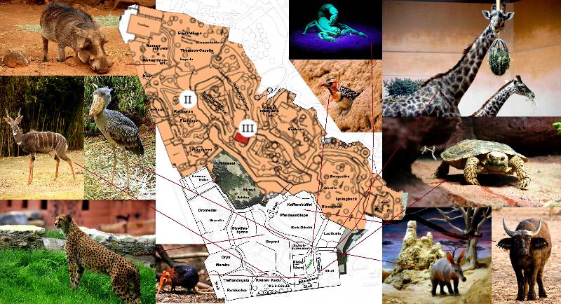 | Gerrit Wehrenberg: | Es geht weiter... 3. Sambesi (Afrikas Busch, Savannen, Steppen und Wüsten) • Haltungsumlegungen und Artenwechsel • Sambesi-Erweiterung mit neuen Freianlagen und Volieren sowie Afrikahaus (Giraffenlaufhalle, Afrikahalle, afrikanische Nachttierabteilung, Huftierstallungen) Foto: Übersichtsplan vom neuen insgesamten Sambesibereich. Aufgrund der verschlechterten Qualität beim hochladen hier möchte ich euch nochmal den Link für alle Grafiken geben: http://s280.photobucket.com/user/diangeleo/library/?sort=3&page=1 Dort werden alle Grafiken bezüglich des Masterplan zu finden sein. Von den Pakaris und Nasenbären kommend wird man in Zukunft die Themenwelt Sambesi als zweites betreten. Es wäre ebenfalls eine Schleife durch Kibongo, ohne eine Unterbrechung im Sambesi möglich gewesen, allerdings ist am Sambesi eine Gastronomie vorhanden die ab diesem Zeitpunkt des Besuchs von vielen Besucher wohl gerne genutzt werden wird. Diesbezüglich wäre eine gastronomische Einrichtung im optionalen Aquarium erwägenswert. Auf dem etwas erweiterten Bereich der ehemaligen Paradieskranichanlage würde in Zukunft eine Zebramangustengruppe das afrikanische Begrüßungskomitee bilden. Auf die aktuelle Straußenanlage würden eine Kuhantilopenart und Warzenschweine gehalten; vorausgesetzt die Vergesellschaftung funktioniert. Auf der Ostseite des Geheges entstünde eine kleine neue Einsicht in einen künstlichen Warzenschweinbau, der oberhalb bepflanzt und sonst als Erdaufschüttung getarnt ist. Die Nordafrikanischen Strauße kommen auf die bestehende Sahara-Anlage zu den Addax und Somali-Wildeseln. Die dazugehörigen Ställe würden erneuert. So sind die Zuchttiere nahe der potenziellen Aufzuchtanlage am Kamelmarkt. Weißbauchkormorane würden die Eurasischen Kormorane ersetzten; weitere Rosa- sowie Zwergflamingos die Kuba-und Chileflamingos, die an andere Zoos gehen würden. Dies soll nicht nur biogeografisch korrigieren, sondern die leider immer noch vorhandene Hybridenzucht vermeiden. Artbastarde könnten in der Gruppe bleiben, müssten aber zur Sicherheit sterilisiert werden. Das den Sambesi bevölkernde Wassergeflügel soll auf ein rein afrikanischen Bestand umgestellt werden. Graukopfkasarkas, Gelbschnabelenten, Nil-und Blauflügelgänse bleiben dabei im Bestand. Alle weiteren Formen würden in ihrer Haltung umverteilt, auslaufen oder abgegeben. Beispielsweise Sporengänse, Afrikanische Zwergglanz-, Hottentotten-, Kap-, Südafrikanische Löffel-, Rotschnabel-, Südafrikanische Schwarz-, Hartlaub-, Afrikanische Rotaugen- sowie Maccao-Ruderenten, Hauben-und/oder Schwarzhalstaucher wären als Besatz denkbar. Inwieweit welche Art winterhart ist bzw. welche Tiere temporär ins Winterquartier müssten wäre zu klären. 3.1 Sambesi-Erweiterung Auf dem Gebiet des Antilopenrings, des Giraffenhauses, der aktuellen Show-Arena mit ehemaligem Bärenstall und der ehemaligen Australienanlage würde eine auch ursprünglich im Gespräch befindliche Sambesi-Erweiterung entstehen. Zu Gunsten des Bestandes würde ich auf eine Erweiterung der Bootsfahrt verzichten. Dennoch würde ein neues Gehege von der aktuellen Route einsehbar sein. Eine Huftieranlage für die Pferdeantilopen sowie Kaffernbüffel und einer Gruppe Kirk-Dikdiks würde entstehen. Eben diese wäre auch von der Bootsfahrt einsehbar. Für die Dikdiks müssten Ausweichbereiche sowie angepasste Gehegebegrenzungen geschaffen werden. Vor allem wegen der Büffel müsste ähnlich derer der Nashörner ein Abgrenzungsbereich im Wasser entstehen. So könnten die Tiere ein Wasserbad nehmen. Die Stallungen der Paarhufer liegt unter einer neuen Aussichtsplattform unterhalb der Brücke, wobei der Hang abgetragen und durch das Gebäude ersetzt wurde. Wie oftmals auch an anderen Stellen sollen solche topografischen Unterschiede von direkt aneinander grenzenden Bereichen durch Spundwände gelöst werden. In meinen Planungen würden auf der Fläche der ehemaligen Wohnanlagen neue Tieranlagen entstehen. Aktuell wurde zugunsten rückwärtiger Bauten sogar die Fläche der Tieranlagen verkleinert, wobei an dieser Stelle neue Personalbauten entstehen. Meine Planungen sehen vor, dass auf dem jetzigen Gebiet der Personalbauten Neubauten im Süden des Zoos entstehen. Die rückwärtige Showtierhaltung würde entfallen und die Aufzuchträumlichkeiten sowie Tierklinik müssten an anderer Stelle neu entstehen. Dies könnte durch Neubauten auf dem jetzigen Personalgelände geschehen, nachdem einige Personalien an den Zooeingang gezogen sind. Direkt neben dem Kamelmarkt würden neue Anlagen nach dem Hannoverschen Grabenprinzip für für verschiedene afrikanische Huftiere entstehen. Beginnend mit einer Oryxart zusammen mit den bisher schichtschiebenden Marabus. In einer weiteren Huftieranlage wären die Kleine Kudus und eine Zweitgruppe Kirk-Dikdiks vergesellschaftet. Die Tieflandnyalas und Rotducker würden die dritte Anlage belegen. Die Stallungen dieser letzten Anlage bestünden, wie auch die Neuen der Giraffenanlage, im Afrikahaus auf der Südseite direkt am Betriebshof. Die beiden andernen Antilopenanlagen erhielten ein gesondertes Stallgebäude an der Westseite. Gegenüber der Huftieranlagen bestünde Freihaltefläche die man etwa für eine Kleinkatzen- oder Vogelvoliere, eine hier passende weitere Huftieranlage oder ähnliches. 3.1.1 Kamelmarkt Im Anbetracht der nordafrikanischen Ausrichtung wäre es nur logisch den dies bezüglich thematisierten Bereich zu erweitern. Außerdem könnte so eine thematische Aufzuchtanlage für junge Nordafrikanische Strauße integriert werden und die Rückseite der aktuellen Sahara-Anlage mit Addax und Somali-Wildeseln genutzt werden. Als Großkamele würde man wieder Dromedare anschaffen. Die dazugehörige Anlage könnte durch Absperreinrichtungen mit der Straußaufzuchtanlage zusammengeschlossen werden und so auch anderweitig individuell genutzt werden. Beispielsweise für abzugebende Tiere aus der Addaxzucht. Als weitere 