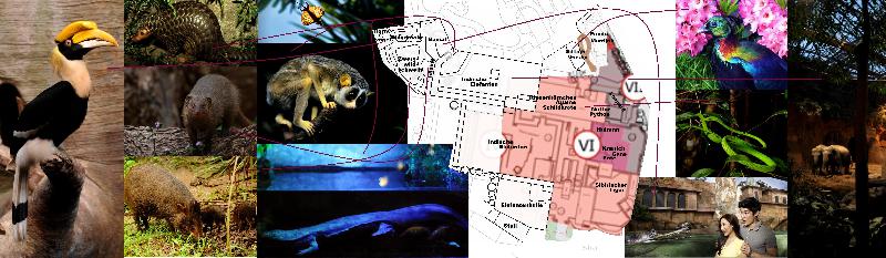 | Gerrit Wehrenberg: | 6. Dschungelpalast (Indischer Subkontinent und Himalaya) • Erweiterung der Elefantenanlagen • Südasiatische Dschungelpalast-Halle (Elefantenlaufhalle, weitere Tieranlagen, Nachttierabteilung) • Ergänzung durch kleinere Tieranlagen Eine unterartreine Zucht bei Asiatischen Elefanten und Hulmans wäre langfristig erstrebenswert. Gerade wo Hannover für diese beiden Formen eine so wichtige Zuchtstelle (und so auch Vorbild) ist und bei anderen (Unter-)Arten ungleich anders Wert auf Zucht gelegt wird. Man siehe allein schon die Diskussion um das Magdeburger Zootiger-Urteil. Die Bullenanlage wird vergrößert und bekommt ein Badebecken. Jungfernkraniche und Streifengänse würden mit den Hulmans vergesellschaftet, bräuchten als winterharte Vögel keine Ställe und wären neben den Mandarinenten ein Winterbesatz. Im alten Dschungelpalast-Shop entsteht eine durch Glasfronten einsehbare Anlage für eine Riesenhörnchenform, Sägerückenagamen und Sternschildkröten. Bei den Tigerpythons zögen in die bisher unbesetzte Oberetage Nasenpeitschennattern. Dafür müssten allerdings einige aber leicht zu installierende Klettermöglichkeiten entstehen. 6.1 Dschungelpalast-Halle 6.1.1 Elefantenlaufhalle Zusammen mit der Down Under-Halle bildet die Dschungelpalast-Halle ein Gebäudekomplex, was Platz spart und Konstruktionskosten senkt. So teilen sie sich die Hallentechnik, Untergeschoß und Versorgungsgänge. Die Halle entsteht auf dem jetzigen Gebiet der Mutter-Kind-Anlage der Elefanten, der Bennett-Anlage sowie dem Robbenrondell bis in etwa an die aktuelle Lamaanlage. Außerdem würde der Hügel mit samt ehemaligen Lauenroth-Pfad abgetragen. Dies brächte eine beträchtliche zusätzliche Fläche zur Bebauung. Das Gebäude hat auch ein zweigeteiltes transparentes Dach um die Lufträume zu trennen. Wünschenswert wären aber auch gläserne Abtrennungen an den oberen Rändern der Hallengrenzen wie an der leipziger Riesentropenhalle, um möglichst helle Räumlichkeiten zu schaffen. Der indische Teil der Tropenhalle nimmt unter anderem den Platz der Mutter-Kind-Außenanlage ein. Mit gleichen Zugängen zu Stallungen und Außenanlage würde hier eine Elefantenfreilaufhalle mit Badebecken entstehen, die im Moment bei diesen für den Zoo so wichtigen Tieren mit gerade den vielen Nachzuchten fehlt. Der Wirtschaftshof hinter dem Elefantenstall würde weiter bestehen und hat so auch Zugang in die Freilaufhalle und die Down Under-Halle. Auf der zur Down Under-Halle liegenden Seite der Elefanteninnenanlage ist eine als indische Tempelmauer getarnte Gebäudewand gezogen hinter der Wirtschaftswege verlaufen und zum Elefantenwirtschaftshof führen. Der entstehende Streifen oberhalb dieser Mauer unter dem Glasdach wäre, außer Rüsselreichweite, bepflanzt und diente so auch der botanischen Gestaltung an dieser, in dieser Hinsicht, schwierigen Lage bei den Elefanten. In der Anlage entstünde eine Rettungsinsel für Pfleger die oberhalb auch bepflanzt werden könnte. 6.1.2 Indische Tropenhalle Für ein Zuchtpaar Doppelhornvögel würde eine Voliere entstehen, welche eine als Baumstumpf gestaltete Bruthöhle enthalten würde. Eine begehbare große hohe Voliere, dessen Netz zwischen echten und künstlichen Baumstämmen gespannt ist würde ebenfalls errichtet. Auch innerhalb der Voliere stehen viele Stämme für Südliche Flugdrachen (Draco dussumieri) bereit. Für jedes der gehaltenen Männchen muss ein eigener Baumstamm vorhanden sein, damit es nicht zu ständigen Kämpfen kommt. Beneblungsanlagen sorgen für genügend Luftfeuchtigkeit und die Wasserversorgung der empfindlichen Pfleglinge. Die Besucher werden gebeten auf den Wegen zu bleiben und wenn sie angelandet werden nichts zu tun und abzuwarten bis die Echse wieder verschwindet. Die Machbarkeit einer begehbaren Anlage für diese Tiere muss so erprobt werden und vllt auch erst schrittweise eingeführt werden, nachdem die Pflege erfolgreich verläuft. Als Bodenbesatz könnte man Indische Kappenpittas und Laufhühnchen einsetzten. Wie bei vielen begehbaren Anlagen sind Zoolotsen ein wichtiges Element. In einigen verteilten Terrarien werden Indische Gottesanbeterinnen, Sechsstreifen-Langschwanzechsen, Indische Chamäleons, Indische Schmucknattern und Blutsaugeragamen mit Schwarznarbenkröten gezeigt. Oberhalb der Terrarien sind, wie im Rest der Halle, südasiatische Pflanzen gepflanzt. Hier aber auch in der Afrikahalle wäre eine kleine Anlage für Juwelwespen sehr interessant. Diese Insektenordnung ist in der Zootierhaltung stark unterrepräsentiert und Aussehen, aktives Auftreten sowie Biologie dieser Fortpflanzungsparasitoide durfte sehr attraktiv auch für ONB sein. In einer wegen den Freifliegern übernetzten Anlage können Indische Mungos beobachtet werden. In Nachbaranlagen werden Brillenschlangen sowie Königskobras gehalten und anschaulich auf den „Kampf um Leben und Tod“ hingewiesen, wenn die Schleichkatze die Schlange fressen will; außerdem auf die Räuber-Beute-Beziehung zwischen den beiden berühmten Kobras Indiens. Auch wird der Mythos um die indischen Schlangenbeschwörer gelüftet. Eine Anlage für Ganges-Gaviale mit Unterwassereinsicht und Landteil mit Zuchtmöglichkeit würde entstehen. Als Unterbesatz würden eine indische Weichschildkrötenart und Pfauenaugen-Messerfisch sowie Zebrabärblinge hinzukommen. Eine Infotafel thematisiert die Bedeutung der Zebrabärblinge als wissenschaftliche Modell- und Versuchsart. Rotohr- und Rußbülbüls, Smaragdspinte, Ganges-Brillen- und Sonnenvögel, Indische Glanzkäfertauben, Buntwachteln und Indische Riesenflugfüchse würden frei in der Halle anzutreffen sein. Ein nach oben offene Anlage für eine Herde Zwergwildschweine stände für eine anvisierte Erhaltungszucht mit vielen Versteckmöglichkeiten bereit. Beginnend mit der Schräge die den Unterwassereinblick erst zu dem Elefantenbadebecken und dann den Gavialen ermöglicht, führt der Weg an einigen in die Wände eingelass
