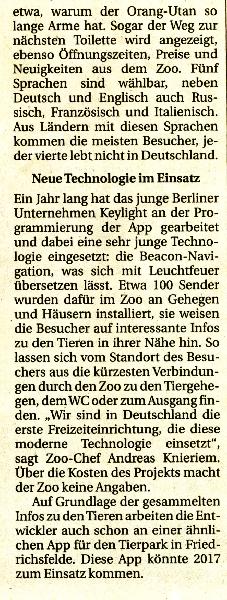 | WolfDrei: | Heute in der Berliner Zeitung: ``Erstmals in Deutschland: das Handy bimmelt vor der Fütterung`` gemeint ist allerdings zunächst der Zoo, der TP 2017. Alles über eine App zu sehen und zu hören. Ich sehe natürlich auch im TP , dass die Besucher auf ihre ``digitale Führung" schauen. Demnächst könnte dann alles auf dem Schirm sein , alles optimiert, alle notwendigen Infos auf dem Schirm - wenn sie dann auch noch den Eintritt bezahlen, ok !! Teil I (28.07.2016, 12:29) | ||