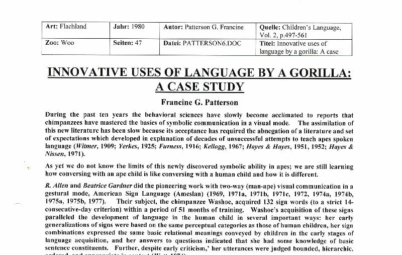 | Klaus Schueling: | Das Zoo-Archiv hat mit einem Nachlass eine Sammlung von Fachartikeln zum Thema Gorilla erhalten. Diese verfügen über einen einheitlichen Kopf auf der Titelseite, der nahe legt, dass es sich dabei um den Ausdruck einer umfangreichen Datenbank handelt. Kann mir jemand sagen, wo dieser Ausdruck herkommt? (06.06.2024, 12:32) |