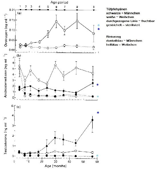 | Liz Thieme: | Habe es nun noch mal zusammengefasst. Ich hoffe man erkennt es... Die Binturongs wurden nicht nach Alterstruktur untersucht, daher habe ich den Gesamtdurchschnittswert ans Ende gesetzt. Das Östrogen bei den Hyänen ist ebenfalls Estradiol, hier wurde es in der Studie vereinfacht geschrieben. Beim Binturong war die Vermutung, dass das Männchen aufgrund der hohen Estradiolwerte eine starke Unterwerfung haben. Warum bei den Tüpfelhyänen das Estradiol eine stärkere Wirkung bei den Weibchen haben soll, als das Testosteron bei den Männchen als "Dominanzhormon" finde ich noch unschlüssig. Aber ich bleibe an dem Thema dran und finde es sehr spannend, dass bei zwei Carnivoren es sich so unterschiedlich ausprägt. Ich hätte hier eine größere Ähnlichkeit vermutet, als zwischen Carnivoren und Primaten, daher hatte ich die Lemuren nicht mit den in Vergleich hineingezogen. (08.12.2020, 14:05) | ||