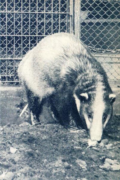 Aus einem Artikel über Ameisenbären in DAS TIER, August 1961: Sieht nach Innenaufnahme im Rundbau aus, damals also mit Maschendrahtvergitterung; man beachte den Schieber gleich hinter dem Frontgitter. Rechts im Bild dürfte Michael Grzimek sein. Der selbe Artikel enthält auch ein weiteres Foto der drei adulten Tiere im begrünten Außengehege sowie Fotos eines jungen, "verwaisten" Ameisenbären, der z.B. einmal auf dem Schoß von Hildegard Grzimek sitzt und einmal auf dem Rücken eines Boxers in einer Wohnung - das wird dann wohl Grzimeks Hündin Assi gewesen sein. (22.12.2007, 21:32)
