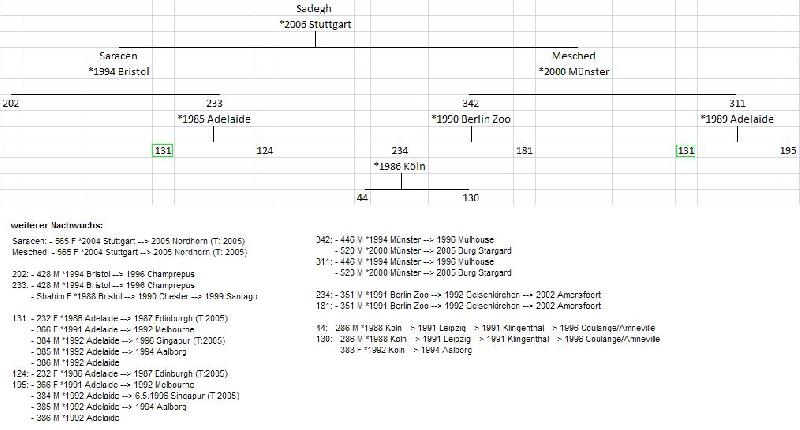 | Jana Müller: | Habe ein Fehler in einem ZB der persischen Leoparden entdeckt. Und zwar geht es um ein Jungtier, was wohl am 04.06.78 in Stuttgart geboren wurde und am selben Tag verstarb. Als Eltern wurden 1,0 Xerxes und 0,1 Farah angegeben. Das Jungtier kann anhand der Daten der Elterntiere nicht so existieren, vielleicht ist auch bei den Elterntieren ein Fehler bei den Daten unterlaufen. Ich liste mal auf: 1,0 Xerxes geb. 26.09.73 in Köln Transfer nach Stuttgart: 24.05.74 Tod: 10.09.78 0,1 Farah geb. 26.09.73 in Köln Transfer nach Stuttgart: 03.10.79 Tod: 03.10.79 Xerxes und Farah sind Vollgeschwister, Farah starb wohl am Tag der Ankunft bzw beim Transport nach Stuttgart. Wenn sie erst 1979 nach Stuttgart kam und gleich starb, kann sie weder den Kater getroffen haben (der starb ja eh schon ein Jahr vorher) weder in Stuttgart ein Jungtier im Jahre 1978 zur Welt gebracht haben. (06.01.2012, 10:40) | ||