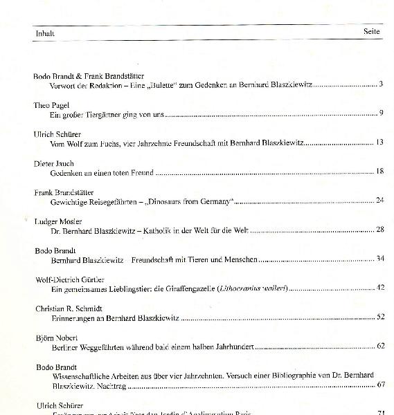 | W. Dreier: | Keine Zoo-Literatur, ein Heft des Erinnerns - an Bernhard Blaszkiewitz. In einer Zeit, in der behauptet wird, alles gäbe es ja im Internet - und so starben u.a. MILU und BONGO - Glück für den "Zoologischen Garten" - hatte er nach seinem Ausscheiden die BULLETTE aufgelegt. Nunmehr erschien die 10 . Ausgabe, ein Erinnerungsheft. Meine erste mehr visuelle "Sichtung" von BB war im Dezember 1989, anläßlich des Silvestertages 1990 hatte er davor bei meinem Besuch im Zoo Berlin eine große Menge an Nahrungsmengen in seine Zoounterkunft getragen - zu übersehen war er ja nicht. Und unbekannt war sein Name mir aus der Literatur nicht. Als Chef dann des TP blieb natürlich für mich die direkte Bekanntschaft nicht aus, war ich doch über viele Pfleger , Mitarbeiter des Leitungsbereiches und Kuratoren im TP nicht ganz unbekannt. Und mein Hobby blieb ihm auch nicht unbekannt - und dazu: "Dreier, sie behalten mal die eben gemachten Aufnahmen schön im Kasten, bis die offiziell in den Zeitungen sind !" Das betraf wohl u. a. Goldtakin, Weißlippenhirsch , Gerenuk, Marco-Polo-Schaf usw. Nur ein kleiner Irrtum, trotz meines Versuches, das zu korrigieren, bestand zwischen uns. Aufgrund eines Artikels, in dem mein Name im BONGO vorkam, glaubte er, dass ich Mitarbeiter des Naturkunde-Museums sei. Dabei war ich doch nur Biochemiker - und noch auf pflanzlichem Gebiet. Die "Bulette" wird also weiter erscheinen - dann mit mehr zoologischen Inhalten, wohl ein Heft jedes Jahr (dieses Heft mit genau 100 Seiten. Hier ein Auszug. (31.12.2022, 15:32) | ||