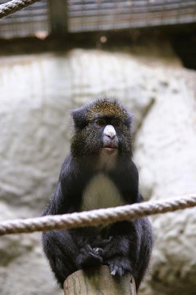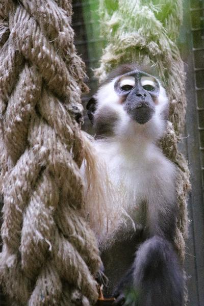| Simon Kirchberger: | Dann vorbei an Großem Ameisenbär, Capybara und Präriehund (alle getrennt) und dem Nebenausgang erreicht man die Käfige der Altweltaffen. Hier natürlich ein Muss: die Weißnasenmeerkatze, gegen die Langeweile zusammen mit 2 Kattas. Des Weiteren Brazza- und Nördl. Zwergmeerkatzen, Rotscheitelmangaben, mehr Kattas und Berberaffen. Die Käfige sind wirklich nichts Besonderes, dunkel und karg… Anbei: Große Weißnasenmeerkatze (17.09.2022, 19:41) | ||