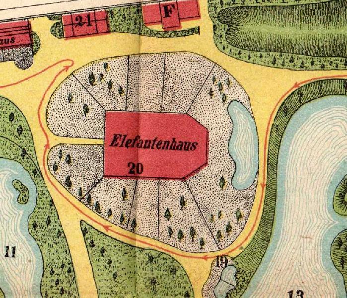 Zwischen heutigem Pfleger-Ausgang und der genau gegenüber liegenden Seite (also an der heutigen ehem. Elefantenanlage) liegen insg. 5 Gehege, von der Pflegertür und der gegenüber liegenden Stelle gehen offenbar Wege auch für Besucher aus.