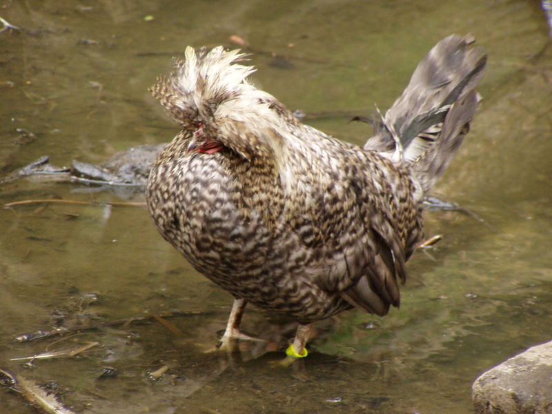 | Ronny: | noch eine Hühnerrasse, aber hier vermute ich, dass es sich um die Rasse Federfüssiges Zwerghuhn in der Farbvariante Dreifarbig ist. (15.07.2008, 23:23) | ||