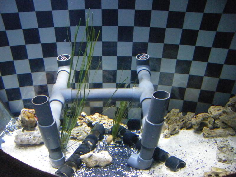 | Michael Mettler: | P.S. Bei ZEBRAmuränen hätte sich doch eigentlich ein gestreifter Hintergrund angeboten... Das "Schachbrett" könnte ein Material-Recycling sein, bei der Sonderausstellung Seepferdchen gab es damals sowas als Boden in einem der Becken (sollte wohl auf die Ähnlichkeit eines Seepferdchens mit dem Springer beim Schach anspielen). (30.08.2011, 10:41) | ||