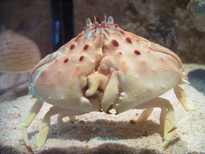 | Michael Mettler: | Anbei ein Beleg dafür, dass auch mit einer relativ einfachen Kamera gute Fotos möglich sind. Die Aufnahme entstand mit meiner Kompakt-Digi (Ricoh Caplio GX) ohne Blitz und Stativ sowie mit Naheinstellung, Abstand zum Motiv ca. 10 cm (die Krabbe ist in natura etwa so groß wie ein halbierter Apfel). Mittlerweile nehme ich die Digitalknipse immer zusätzlich zu meiner "richtigen" Kamera auf Zootouren mit, um im Bedarfsfall mit ihr dort Fotos machen zu können, wo die Verwendung von Blitz nicht erlaubt ist. (11.10.2007, 21:21) | ||