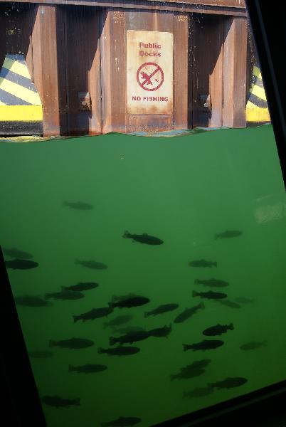 | Gerrit Wehrenberg: | Yukon Press News Der Schwarm: Wie schon von Herrn Engel angekündigt ist nun Fischbesatz in den Eisbärbecken zu bestaunen. Die Neuzugänge die in Henrys Underwater World seit dieser Woche zu sehen sind haben wohl zugleich die höchste Individuenzahl im Zoo (abgesehen von den Ameisen natürlich!). Wenn mich nicht allesteuscht, sind es junge Regenbogenforellen. Die drei Eisbären versuchten den ein oder anderen Fisch zu ergattern, doch die Fische sind ihnen immer ein Flossenschlag voraus... Kleidungsordnung: Mir fiel heute auf, dass die Brillenpinguine fast gänzlich adultes Federkleid trugen. War die Mauser in der letzten Zeit? –Apropos: Man darf gespannt sein wann die Tiere endlich einziehen! Auch die Karibus sind nun mit ihrer dunklen Sommerkleidung zu beobachten. P.S. sorry für die vielen „Fehl-Posts“! Ich bekomme die Fotos nicht rein...na ja! Foto: No Fishing! (12.07.2010, 23:45) | ||