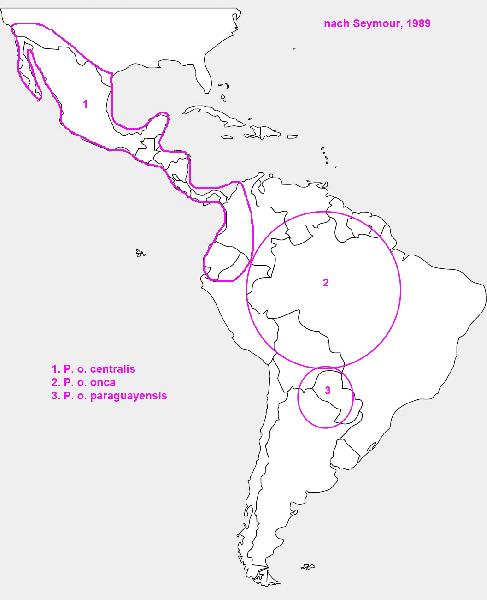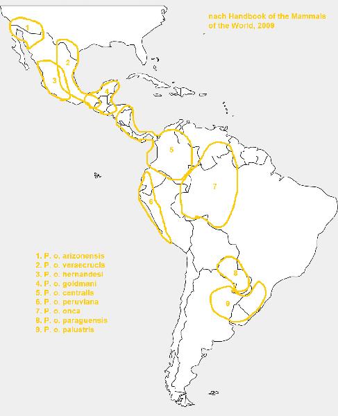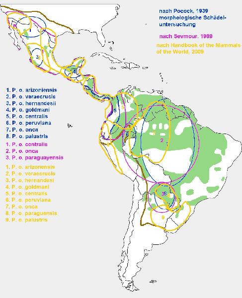 | Liz Thieme: | Damit ich nicht so viel Arbeit habe, zitiere ich mich mal selber: Bevor die ersten Genuntersuchungen durchgeführt wurden, entwickelten die Wissenschaftler die Systematik nur anhand von morphologischen und geografischen Merkmalen. Diese Untersuchungen ergaben für die Familie der Katzen vier Gattungen (Acinonyx, Felis, Neofelis und Panthera) (Nowak & Paradiso, 1983). Spätere genetische Untersuchungen teilten dann die Felidae in acht Untergruppen auf: die Ozelot-Linie, die Hauskatzen-Linie, die Großkatzen-Gattung, die Puma-Gruppe, die Luchs-Gattung, die Asiatische Leopardkatzen-Gruppe, die Karakal-Gruppe und die Asiatische Goldkatzen-Gruppe (Johnson & O?Brien, 1997). Als Art passt der Jaguar in beide Einteilungen. Soweit ist die Systematik einfach. Die Unterarten-Systematik ist jedoch umso komplizierter bzw. umstrittener. Bis in die 1930er gab es viele Untersuchungen, aus denen über zwanzig vermeintliche Unterarten resultierten. Die Basis für die jüngsten Forschungen legte Pocock 1939, indem er die morphologischen Unterschiede von Schädeln untersuchte. In seinen Ergebnissen stellte er klar, dass einige vorherige Unterarten ein und dieselbe sein müssen. Am Ende legte Pocock eine Liste von acht Unterarten fest (Pocock, 1939). (Karte 2) Mitte der 1990er untersuchte Larson Pococks Daten und zusätzlich weitere Schädel, deren geografische Herkunft bekannt war. Sie kam zu dem Ergebnis, dass es Unterschiede von Nord nach Süd gab, aber dass es mehr Variationen innerhalb Pococks Unterarten gibt als zwischen ihnen (Larson, 1997). Eine große Wende kam fünfzig Jahre nach Pococks Ergebnissen. Seymour nahm die Studie von Pocock noch einmal unter die Lupe. Pocock hatte seine eigenen Untersuchungen kommentiert, da ihm teilweise nicht genügend Material für eine kritische Auswertung vorgelegen hatte. Seymore sagt, dass die Kommentare von Pocock implizieren würden, dass einige vorherige Bezeichnungen Synonyme für andere seien. Streiche man alle Synonyme, so blieben nur drei Unterarten übrig (Seymour, 1989). (Karte 3) Für spätere (mitochondrial)genetische Untersuchungen von Eizirik standen nur 44 Individuen mit unterschiedlicher geografischer Herkunft zur Verfügung. Je nach Untersuchungsmethode kamen hier verschiedene Ergebnisse heraus. Zum einen ergab eine phylogenetische Analyse, dass die mitochondriale DNA (mtDNA) kaum die Existenz von wirklichen phylogeografischen (stammesgeschichtlichen und geografischen) Einheiten unterstützt. Solch deutliche Anzeichen zeigte hier nur die Gruppe, die aus dem südlichen Südamerika stammte. Bei einer weiteren mtDNA-Untersuchung konnten jedoch zwei phylogeografische Hauptgruppen unterschieden werden. So lässt sich der Norden vom Süden trennen, vielleicht durch den Amazonas. Eine weitere regionale Unterteilung im nördlichen Bereich kann vermutet werden. Neben der mitochondrialen DNA wurden auch Mikrosatelliten in der DNA analysiert. Diese Ergebnisse unterstützen mindestens drei oder vier unvollständig isolierte phylogeografische Gruppen (1. Mexiko und Guatemala, 2. südliches Mittelamerika, 3. nördliches Südamerika (nördlich des Amazonas), 4. südliches Südamerika (südlich des Amazonas)). Interessanterweise scheint der Amazonas bei Weibchen eine größere Bedeutung als Grenze zu haben als bei Männchen, worauf die mtDNA schließen ließ (Eizirik, et al., 2001). Diese geschlechtlichen Unterschiede zeigen sich auch in allgemeinen Beobachtungen von Felinen, bei denen die Weibchen eine größere Ortstreue zeigten als Männchen (Kitcher, 1998) (de Oliveira, 1994). Im ?Handbook of the Mammals of the World, Vol. 1, 2009? werden neun Unterarten gelistet (Wilson & Mittermeier, 2009). (Karte 4) Ruiz-GarcÃa und Kollegen untersuchten bei 248 Individuen mit Hilfe von 12 Mikrosatelliten Loki und drei mtDNA-Genen die möglichen Unterschiede, allerdings konnten keine phylogeografischen Strukturen gefunden wurden. Auf Basis dessen hat sich die Cat Specialist Group der IUCN dafür entschieden den Jaguar als monotypisch zu führen. Zu der Frage der Populationsdichte je Unterart bzw. je theoretisch möglicher Unterart kann ich daher auch für die Natur nichts sagen. Die IUCN ist bei den meisten Tieren nicht auf dem aktuellen Stand. Um einen Überblick zu erhalten, sollte man jedoch nur eine Quelle nutzen. Ich zitiere im Folgenden daher trotzdem die IUCN: Historische Bewertung der Überlebensfähigkeit von Jaguar Hohe Überlebenschance: Sanderson et al. (2002) schätzten, dass Populationen in 70% des Jaguar-Gebiets (über 6 Millionen km²) eine hohe Überlebenswahrscheinlichkeit hatten. Der größte Teil dieses Gebiets besteht aus dem Regenwald des Amazonasbeckens und angrenzenden Gebieten des Pantanal und des Gran Chaco (Torres et al. 2007). Andere von Sanderson et al. (2002) berücksichtige Gebiete, scheinen eine hohe Wahrscheinlichkeit für eine langfristige Jaguar-Persistenz zu haben, inkl. tropische feuchte Tieflandwälder in Mesoamerika (die Selva Maya von Guatemala, Mexiko und Belize) und einen schmalen Streifen des Choco-Darien von Panama und Kolumbien nach Nordhonduras. Mittlere Überlebenschance: Sanderson et al. (2002) schätzten, dass Jaguar-Populationen in 18% der Jaguar-Reichweite (1,6 Millionen km²) eine mittlere Überlebenswahrscheinlichkeit hatten. Diese Gebiete grenzen im Allgemeinen an Gebiete mit hoher Überlebenswahrscheinlichkeit an und umfassen einen großen Teil des nördlichen Cerrado, den größten Teil der venezolanischen und kolumbianischen Llanos sowie den nördlichen Teil Kolumbiens an der Karibikküste. In Mittelamerika und Mexiko gehören dazu das Hochland von Costa Rica und Panama, Südmexiko, sowie die beiden östlichen Gebirgszüge Mexikos, Sierra de Taumalipas und Sierra Madre Oriental. Geringe Überlebenschance: Sanderson et al. (2002) stuften den Rest des Jaguar-Bereichs (12%) als mit geringer Überlebenswahrscheinlichkeit für Jaguar und als am dringendsten zu schützen ein. Diese Gebiete umfassen den Atlan