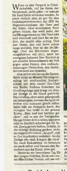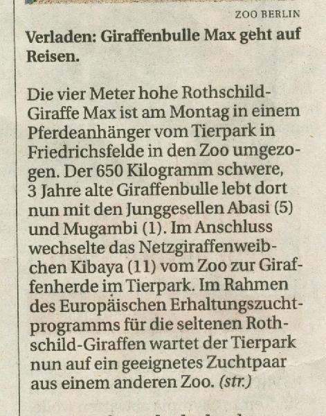 | Erik Richter: | Leider gibt es nicht nur gute Nachrichten aus dem Tierpark: Der junge Giraffenbulle Fritz musste am Montagmorgen eingeschläfert werden. http://www.bz-berlin.de/berlin/lichtenberg/tierpark-giraffe-fritz-muss-eingeschlaefert-werden (19.07.2016, 00:32) | ||
