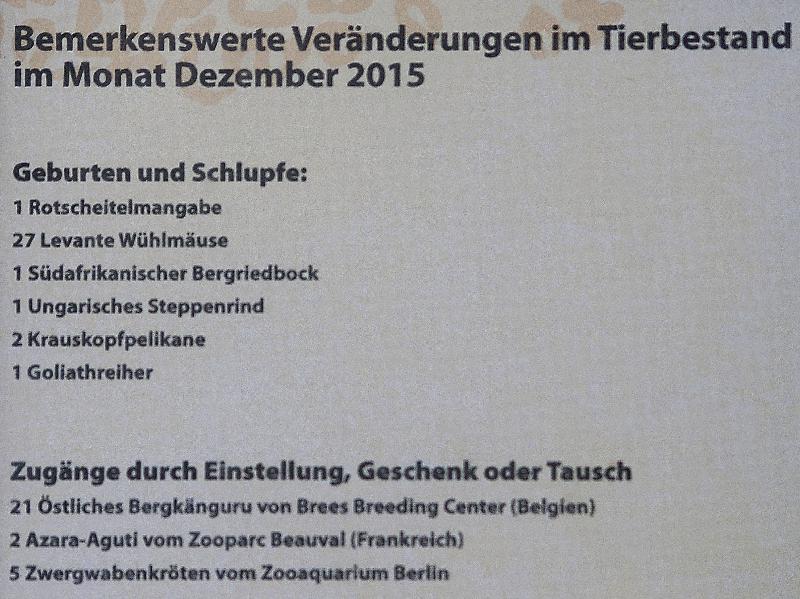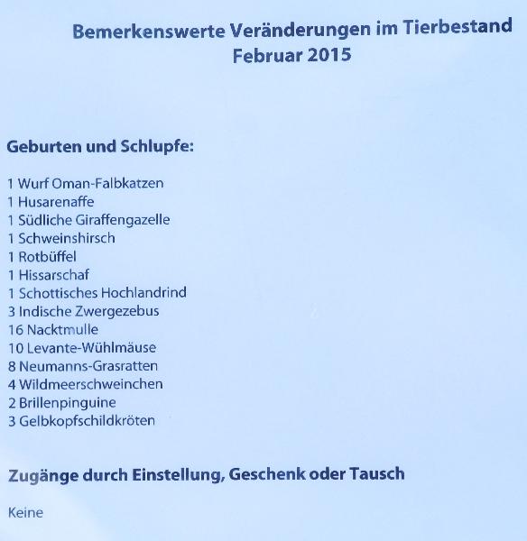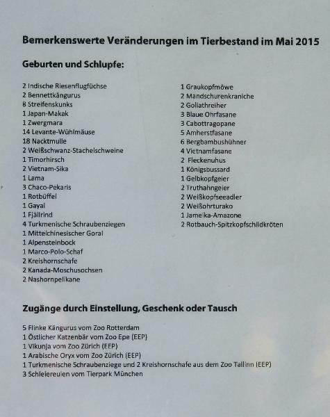 | Erik Richter: | Anbei die Veränderungen im Tierbestand im Juni. Der neue Manul lebte zumindest letzte Woche noch im Alfred-Brehm-Haus. Der andere war aber immer noch im ehemaligen Kolkraben-Gehege im Erweiterungsgelände anzutreffen. (Es sind jetzt also wieder zwei Manule.) (07.07.2016, 15:28) | ||