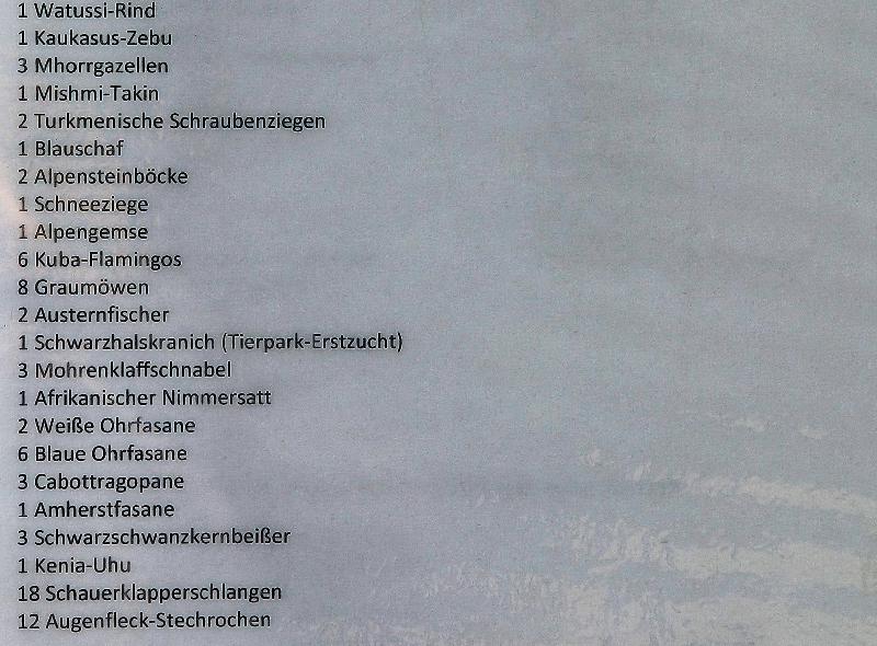 | WolfDrei: | Kurzer Besuch im TP: Nachwuchs (2) bei den Schwarzschabelstörchen, 4 Jungtiere bei den Bucharahirschen, 3 Addaxe, 2 Schneeziegen und Nachwuchs "bei allen anderen". Die Tanggänse sind umgezogen zum Alpakagraben gegenüber der Känguruhanlage (etwas versteckt) (01.07.2008, 17:48) | ||