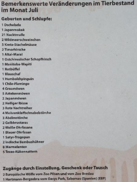 | WolfDrei: | Bautechnisches: am 4.8. werden laut Aushang die beiden Spielplätze eröffnet. Eigentlich waren heute nur noch kleinere Erdarbeiten zu sehen, insbesondere wurde mit einem Kalk-Sand-Gemisch Wege bereitet (alter Spielplatz) oder Mulch ausgebreitet (seltsamerweise ein Hobelspan-Mulch, grün gefärbt) für den `` Waldspielplatz``. Anbei ein Blick über die Plansche zur Rutsche. Tierisches: Eine Sambargeburt, ein Damarafohlen - aber: wieder ein Küken bei den Schwarzhalskranichen. Eine Maralgeburt steht weiter aus, nach Aussagen wird es bei den Schneeziegen keine Geburt geben, bei den Mishmitakins bleibt der Bock abgesperrt - es gibt genügend. Die Präriehunde sind weiter am Buddeln - in der Erde. In der Afrikavoliere üben in drei Nestern die Abdims das Fliegen, Hagedasche sein geschlüpft und auch bei den Klaffschnäbeln liegt was im Nest. (26.07.2016, 21:00) | ||
