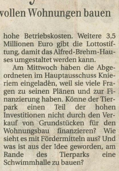 | Mark Meier: | Der entscheidende Passus, wonach die 15 (statt 16,8) Mio NICHT allein für Himalaya sondern für viele verschiedene Projekte genutzt werden können: "Im Tierpark soll die Anordnung der Gehege zukünftig verstärkt einer geographischen Orientierung folgen, wodurch der Erlebnisfaktor für den Besucher gesteigert wird. Auch zeitgemäße didaktische Leitideen können so besser verwirklicht werden. Eine zukunftsorientierte Tierhaltung soll den Tieren das Zusammenleben in großen Herden und Vergesellschaftungen ermöglichen. Zudem soll in Teilen daraus der Bau der Himalaya-Gebirgslandschaft finanziert werden ? welcher zugleich die Entsorgung der Haufwerke löst. Die Aufwertung des Dickhäuterhauses im Tierpark ist geplant. Das bestehende Gebäude soll im Rahmen der geplanten Umgestaltung zu einem einzigartigen und naturnah gestalteten Erlebnisbereich weiterentwickelt werden. Außerdem werden die Mittel für die Verbesserung der Besucherinfrastruktur verwendet. Ziel ist es, umfangreiches Wissen über die einzelnen Tierarten an inländische und ausländische Besucher vermitteln zu können und somit den Tierpark als Ausflugsziel für Einheimische und Touristen attraktiver zu gestalten." (19.07.2016, 21:37) | ||