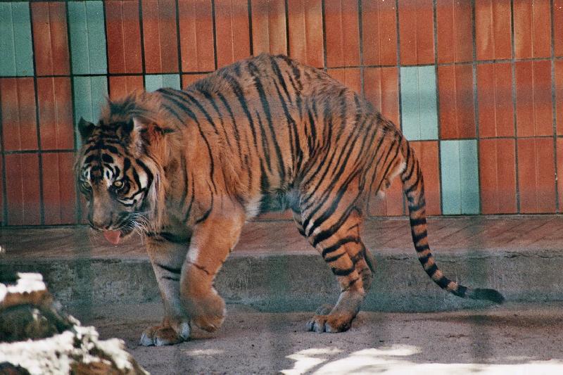 | Michael Amend: | Das Foto zeigt tatsächlich einen Sumatra-Tiger, Sorry. Hinterinder ( der Tierpark hält corbetti)habe ich einen inmder Innen-aÁnlage gesehen, einen einzelnen Sumtra-Kater im Außenkäfig bei den Präriehunden,die Sibirer auf der anderen Seite im Außenkäfig. Hier noch ein Bild des einzelnen Sumtra-Tigers, sieht nicht wirklich fit aus... (01.08.2008, 19:39) | ||