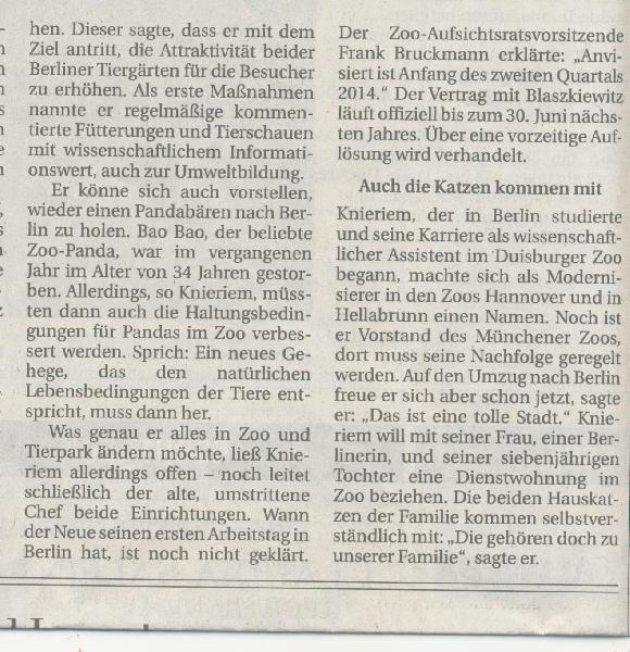| Mark Meier: | Angeblich ist die Nachfolge von Falk Dathe nun entschieden. Dieser geht Ende des Jahres in den Ruhestand. Bei der Ausschreibung für die neue zoologische Leitung des Tierparks soll die bisherige Direktorin vom Zoo in der Wingst, die 39-Jährige Nadja Niemann, das Rennen gemacht haben. Offiziell wurde diese Pressemeldung bisher aber von keiner Seite bestätigt. Frau Niemann hat den alten Job wohl bereits gekündigt, allerdings mehr wegen Querelen mit der lokalen Politik. Hier in Berlin würde sie ja sozusagen etwas in die zweite Reihe treten und von so etwas verschont bleiben. Sonst weiß ich an sich nichts über sie, weil ich den Zoo in der Wingst nicht weiter verfolgt habe. Dem Hörensagen nach soll Frau Niemann dort aber gute Arbeit geleistet haben. Ich bin gespannt, wie sie sich hier einfügen und einbringen kann -also natürlich wenn es tatsächlich auch so kommt und sie den Job erhält. http://www.bz-berlin.de/lichtenberg/sie-ist-die-neue-chefin-im-tierpark-friedrichsfelde (05.07.2016, 09:37) | ||