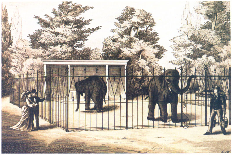 | Michael Mettler: | Sorry, hier das Bild. Ein im selben Buch enthaltener Zooplan von 1863 zeigt etwas Interessantes: Zum Bestand gehörten damals Afrikanischer und Indischer Elefant, Nashorn und Flusspferd (Artis war seit 1860 einer der ersten Flusspferdhalter überhaupt), aber alle vier Arten waren getrennt voneinander in unterschiedlichen Parkbereichen untergebracht! Thematische Zusammenhänge spielten offensichtlich keine Rolle; die nächsten, wenn auch durch Wege und Pflanzrondelle getrennten Nachbarn des/der Afrikanischen Elefanten (übrigens in einem relativ großzügigen Auslauf gehalten) waren z.B. Pfaue, Antilopen, Rentiere, Haus- und Wildschafe; im gleichen Haus, mit einem Auslauf an dessen Rückseite, waren noch Tapire untergebracht. Auf vielen der alten Darstellungen des Buches sind Reitelefanten zu sehen; das "Nutztier" Elefant spielte also in der Präsentation eine wichtige Rolle. (19.10.2008, 17:38) | ||
