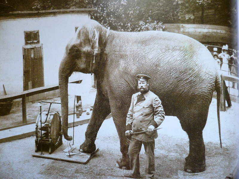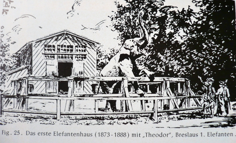 | Oliver Jahn: | Der erste Elefant, ein 12 jähriger Bulle kam 1873 in den Zoo Breslau. Dort war er sehr einfach in einem hölzernen HAus untergebracht mit dicken Gittern drum herum. Er demolierte dieses Haus mehrfach und dann brannte es. Jetzt erst baute man neu, eines der größten Dickhäuterhäuser Europas. Dieses wurde dann 1888 eröffnet.Der Bulle zog dann aber allein in dieses Haus, neben Tapire, Flusspferde und Nashörner. Und erst nach dem der Bulle starb, wurde er ersetzt durch zwei junge Elefanten, eine 15 jährige Kuh und einen 11 jährigen Bullen. (19.10.2008, 21:43) | ||