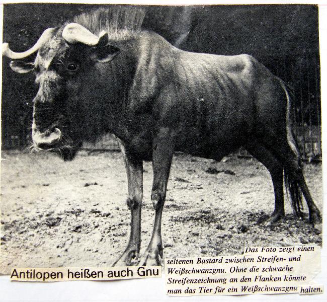 | Michael Mettler: | Was man nicht alles im eigenen Digital-Archiv findet: Diesen undatierten Zeitungsausschnitt aus DAS TIER muss ich schon mal zu irgendeinem Zweck gescannt haben. Das muss der Zürich-Leipziger Gnu-Bastard sein, ich weiß aber nicht, wo das Foto entstand. (22.07.2009, 20:06) | ||