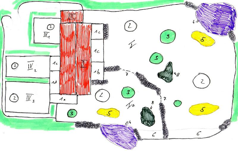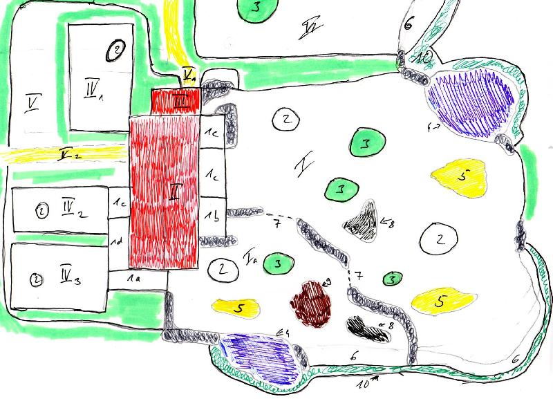 | Henry Merker: | Anbei befindet sich die beschriebene Skizze. Die Skizze ist von mir nicht maßstabsgetreu gezeichnet worden. Legende zur Skizze: Nummer Beschreibung I Außenanlage (groß) für Weibchengruppe Ia Bullenanlage (kann von Weibchenanlage separiert werden) II Stallgebäude III Gebäude für Tierpfleger (Werkzeuge, Pausenraum usw.) IV 1 Bullen- oder Mutter-Kind-Gehege IV 2 Zuchtgehege 1 IV 3 Zuchtgehege 2 V Wirtschaftshof 1a Bullenvorgehege 1b Vorgehege für Bulle oder Kuh 1c Vorgehege 1d Vorgehege (als Verbindung für IV 2 und IV 3 verwendbar) 2 Unterstände (Sonnen- und Regenschutz) 3 umzäunte Bauminseln 4 Wassergraben 5 Sandkuhlen 6 Trocken- oder Wassergraben 7 Durchgang (von I zu Ia und umgekehrt) 8 Schlammsuhle grüne Streifen um der Anlage Hintergrundbepflanzung zur Abschirmung der betreffenden Bereiche grau punktierter Bereiche Felsformationen zur Abschirmung oder Umgrenzung der Außenanlagen (26.07.2009, 11:42) | ||