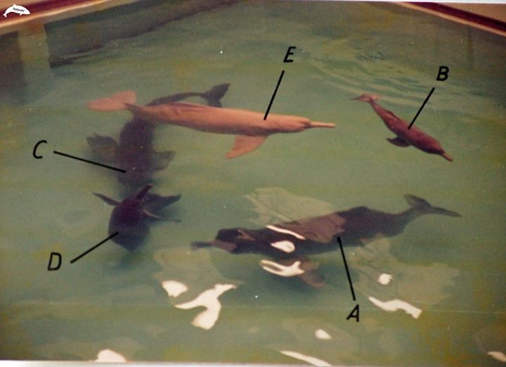 | Tim Sagorski: | @ Niklas Groeneveld: Das zweite Foto stammt aus der Fotoreihe, die "Dolphinaria Truth" kürzlich bei Facebook präsntiert hat. Es entstand wohl kurz nach dem Eintreffen der Toninas in Duisburg und zeigt die Tiere wohl schon im Tonina-Pool (es muss kurz nach dem Eintreffen der Tiere entstanden sein, da die albinotische "Oma" relativ früh verstarb (wie auch das zweite gefangene Weibchen). Das mit "B" markierte Tier auf dem Foto müsste dann also, der immer noch lebende "Baby" / "Apure" sein. (26.10.2016, 08:50) | ||