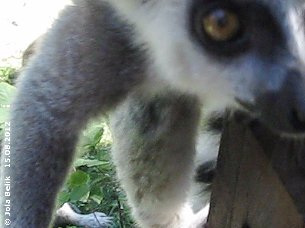 | Jolantha Belik: | Das beste war aber in der Katta-Anlage. Im Winter laufen die Kattas im Kleinaffenhaus frei herum, sie sind furchtbar neugierig, man darf sie aber nicht streicheln. Im Sommer kann man in die Außenanlage hinein gehen. Ein Volontär paßt auf, dass man die Tiere in Ruh läßt und nicht angreift. Nun ja, wie könnte es anders sein, Katta kommt zu mir her, schnuppert mich an und will schon auf die Hand rauf klettern - Volontär schimpft, Katta geht. Wenige Minuten später, ich mach grad einen Film mit der Digicam, eine Kindergruppe um mich herum, plötzlich große Aufregung, ein Katta klettert auf die Absperrung rauf, hält meine Hand fest und schaut in die Digicam rein. Und ich bekomm gschimpft, dass ich das Tier nicht angreifen darf ... das Standbild aus dem Video zeigt den neugierigen kleinen Kerl, ist leider ziemlich unscharf, no na, wenn der Fratz direkt vor der Linse plötzlich hockt. Übrigens, Kattas haben sooo weiche Fußerl und ein urweiches Fell! :-) (20.08.2012, 18:31) | ||