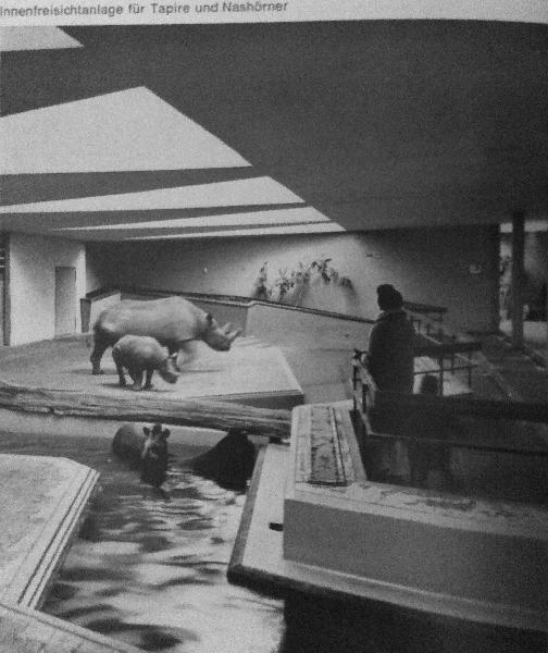 | Jan Jakobi: | Im Februar 2014 sah ich erstmals Nashörner in einer Freilaufhalle, nämlich im 2010 eröffneten Magdeburger Nashornhaus. Die Freilaufhalle hat mir sehr gut gefallen. In vielen Zoos werden und wurden Nashörner für die Nacht in Einzelboxen untergebracht. Möglicherweise war der Zoo Hannover der erste Zoo, der Nashörner in einer Freilaufhalle (in dem Fall: Freilauffläche) hielt. Die Anlage befand sich im Elefanten- und Nashornhaus, auf der Anlage lebten zuletzt Tapire. Anbei eine Innenaufnahme dieser Anlage aus dem Hannoveraner Zooführer 1967. Auf dem Foto ist zu erkennen das der Boden kein Sandboden ist, wie es in Magdeburg der Fall ist. Gibt es noch weitere Nashorn-Freilaufhallen (Freilaufflächen)? Wann wurden diese gebaut? (28.05.2014, 23:44) |