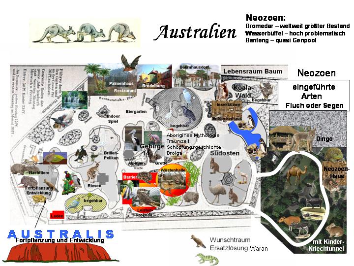 | Ulli: | Ich habe mit Spannung diese letzte Diskussion gelesen – manchmal ging sie ins Grundsätzliche, was ich aber sogar als anregend empfand. Ich habe einmal versucht alle Diskussionsansätze, auch in Hinblick auf puristische Geozoo-Ansätze auf Basis des alten Hannover 1885-Plans umzusetzen. Nahe liegend waren bei dem Gedankenspiel aufgrund der Besonderheit Australien und natürlich der mitteleuropäische Raum. Ich denke für beide Bereiche ist eine attraktive Gestaltung insbesondere für Kleinzoos oder Provinzzoos mit begrenzten Mitteln umsetzbar. Es ergibt sich sogar ein Tierbestand, der nahe an einen umfassenden Bestand heranreicht und auch so etwas wie ein Alleinvertretungsmerkmal beinhaltet … wenn auch ohne Primaten, Großkatzen und Elefanten. Vielleicht regen diese konkreten Ansätze die Diskussion noch einmal an. (24.07.2015, 21:07) | ||
