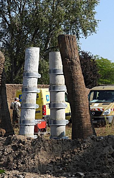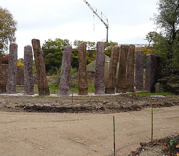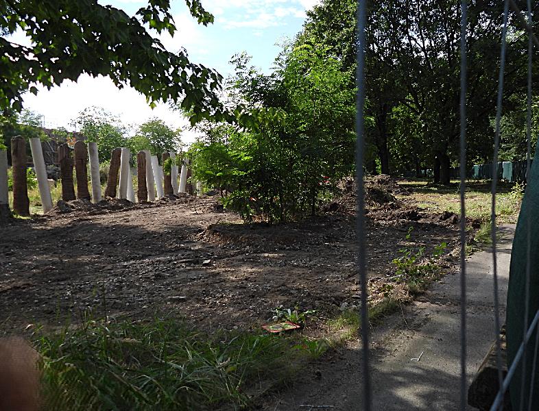 | W. Dreier: | Die Art der Besucher-Absperrung an der nördlichen Seite des Ele-Hauses an den "Sichtlöchern" wird sichtbar: Bepflanzung an den Einsichten, Absperrungen mit "authentischen" Pfählen; rechts an den Betonpfählen sieht man die 5 Ringe für die Stahlseile (06.12.2024, 11:17) | ||