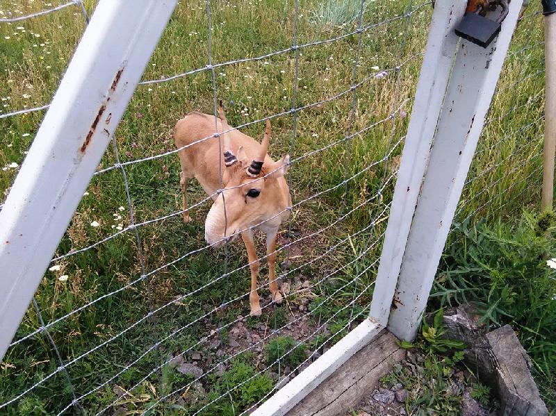 | Thomas Duetsch: | Hallo, die Saiga Haltung im Osten der Ukraine war ein Plan des Zoos Kharkiv und zwar von Oleg Gritschenko. Der Plan der Zooleute war eine zweite Population aufzubauen, zur Sicherheit falls der Bestand von Askania Nova einmal durch Krankheit gefährdet wäre. Als ich im Juli 2017 an der russischen Grenze war, hatte Oleg ein Gelände von 5 Fußballfelder eingezäunt, Dort hatte er zwei junge Böckchen und 3 Weibchen aus den Bestand von Askania Nova untergebracht. Außerdem waren noch 10 Mufflons dabei. Das Gelände sollte auf 20 Fußballfelder vergrößert werden. Dort leben keine Menschen. Es gab nur einen Wächter und einen Schäferhund, Für mich war sehr erstaunlich, wie zutraulich die beiden Böcke mir gegenüber waren. Beigefügt ein Foto. Morgen werde ich einen Brief von Viktor Schapowal, Direktor von Askania Nova veröffentlichen. (14.04.2022, 15:23) | ||