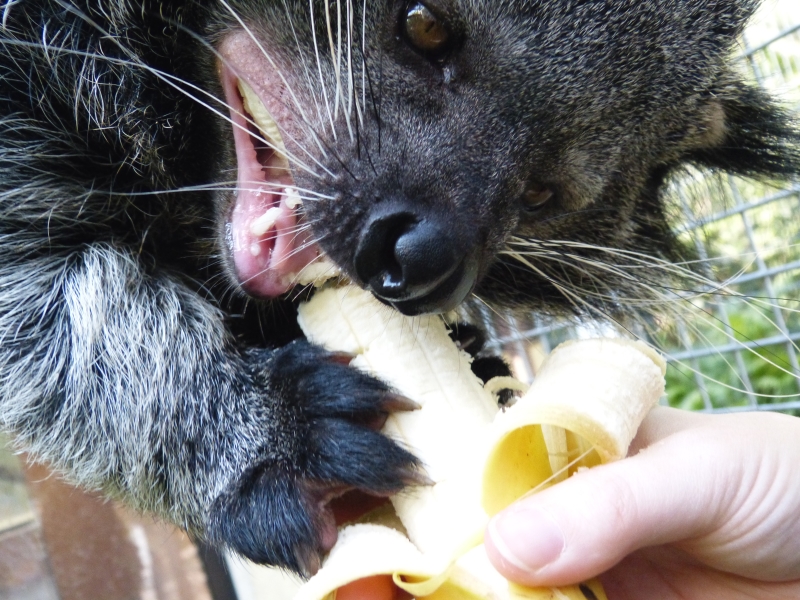 | Liz Thieme: | Hier stinkt es sagen die meisten Besucher, ich persönlich mag den süßlichen Geruch von Binturongs. Ich habe mir nie Gedanken dazu gemacht, warum dies so sein sollte. Warum riecht ein Fuchs wie ein Fuchs und eine Wühlmaus wie eine Wühlmaus? Mir egal?. Eigentlich. Im September wurde mir dann erzählt, dass der Binturong den gleichen Stoff ausscheidet, der auch bei Popcorn für den süßlichen Geruch zuständig ist. Binturongs mit Popcorn zu vergleichen kommt mir immer noch komisch vor, weil es mich nicht an Popcorn erinnert - für mich riecht es im Kino oder auf dem Jahrmarkt (oder auch mal zu Hause) nicht nach Binturong, denn das müsste man dann ja auch umgekehrt sagen können. Also sah ich mich mal wieder vor einer Recherche und einem biochemischen Tauchgang? Lange Zeit hat man den Ursprung des Geruchsstoffes der diesen süßlichen Geruch hervorruft in dem Markierungssekret gesucht, doch da hat man nichts Passendes gefunden. Der größte Teil der verfügbaren Literatur zu Binturong-Sozial- und Fortpflanzungsverhalten stammt aus Studien an in Gefangenschaft lebenden Zuchtpaaren und ihren Nachkommen. Es wird angenommen, dass sie in freier Wildbahn relativ solitär leben. In Gefangenschaft werden Binturongs normalerweise allein oder in gemischtgeschlechtlich gehalten. Weibliche Binturongs sind größer und schwerer als die Männchen und dominieren, sie erhalten z.B. Vorrang beim Zugang zu Nahrungsmitteln und Schlafplätzen. Die nun folgenden Informationen entstammen aus einer Untersuchung, die 2016 in der "The Science of Nature" publiziert wurde. Beide Geschlechter markieren ihr Revier mit Duftsekreten aus einer Perinealdrüse (= am Damm sitzend)und Urin. Verschiedene Fleischfresser, darunter große Feliden, verschiedene Caniden, Mustelids und Ursids scheiden eine reiche Anzahl von flüchtigen Harnverbindungen aus, die sich häufig nach Geschlecht unterscheiden. Sowohl die Strukturierung als auch die Signalzusammensetzung bei diesen fleischfressenden Arten kann eine Vielzahl von Funktionen zwischen und innerhalb der Gruppe erfüllen. Beide Geschlechter riechen auch nach Urin, da sie häufig ihre Schwänze und Füße "einweichen". Diese gemeinsamen Markierungen und Verhaltensmerkmale legen eine Schlüsselrolle für die Duftmarkierung bei beiden Geschlechtern nahe, wie auch bei anderen von Weibchen dominierten Arten. Allerdings zeigen männliche Binturongs ein stärkeres Geruchsmarkierungsverhalten als weibliche. Trotzdem führt der weiblicher Östrus bei beiden Geschlechtern zu einer Hochregulierung des Geruchsverhaltens. Die auffallende Rolle der Duftmarkierung bei weiblichen Binturongs in Verbindung mit der mutmaßlichen sozialen Dominanz der Weibchen gegenüber Männchen motivierte die Studie. In der Untersuchung wurden Serumproben (29 Zoo-Tiere / 20,9 ) genommen, um Sexualsteroide zu messen, und zusätzlich Urinproben (26 Zoo-Tiere / 17,9) , um flüchtige Chemikalien zu detektieren. Der Zeitpunkt der Probenentnahme wurde zwischen November und Dezember durchgeführt, um mögliche saisonale Einflüsse zu minimieren. Die Fortpflanzungszeit von Binturongs in freier Wildbahn ist unbekannt; In Gefangenschaft züchten Binturongs das ganze Jahr über, haben aber saisonale Geburtsspitzen. Die Männchen der Binturongs hatten erwartungsgemäß höhere Androgenkonzentrationen als die Weibchen, aber beide Geschlechter hatten gleiche Östrogenkonzentrationen, vermutlich aufgrund der Unterwerfung der Männchen. Zusätzlich geben die Männchen eine höhere und reichhaltigere Reihe an flüchtiger chemischer Verbindungen (eine Mischung aus Säuren, Alkoholen, Aldehyden, Kohlenwasserstoffen, Ketonen) ab als die Weibchen. Einige dieser Stoffe zersetzten sich recht schnell, andere blieben länger erhalten, u.a. das im Urin gefundene 2-Acetyl-1-pyrrolin (2-AP). Das AP-2 war die einzige Substanz, die von jedem Tier ausgeschieden wurde. 2-AP entsteht typischerweise bei hohen Temperaturen und ist wahrscheinlich für den charakteristischen Duft des Binturong verantwortlich. Der Stoff ist bekannt vom Geruch von Mais und aromatischem Reis (z. B. Jasmin oder Basmati). ~ Kleiner Chemieexkurs: Die hierfür verantwortliche Maillard Reaktion ist eine nicht-enzymatische Bräunungsreaktion, bei der Aminosäuren und reduzierende Zucker unter Hitzeeinwirkung zu neuen Verbindungen umgewandelt werden. Sie ist nicht zu verwechseln mit dem Karamellisieren, beide Reaktionen können aber gemeinsam auftreten. In der mehrstufigen Reaktion wird ab etwa 140 °C zuerst unter Abspaltung von Wasser eine Aminosäure mit einem Zucker verbunden. Wie das nun im Binturong funktioniert ist eine andere Geschichte. ~ 2-AP wurde als einzige von den flüchtigen Chemikalien häufiger bei Männchen gefunden als bei Weibchen und war mit den Androstendionkonzentrationen bei beiden Geschlechtern verbunden. Es könnte daher sein, dass Informationen über Geschlecht und Fortpflanzungszustand über die ausgeschiedenen Stoffe vermittelt werden. Allerdings konnte kein Zusammenhang zwischen Steroidkonzentrationen und der 2-AP-Konzentrationen festgestellt werden. Obwohl 2-AP auch in geringen Konzentrationen im Maus-Urin und in bestimmten exotischen Früchten identifiziert wurde, wird es typischerweise mit zubereiteten Lebensmitteln assoziiert. Um diesem zweiten Weg nachzugehen wurde auch das Knabberfutter der Binturongs analysiert (IAMS Chunks) und ob diese die flüchtigen Harnverbindungen beeinflusst haben könnte. Allerdings wurde festgestellt, dass sich die flüchtigen chemischen Profile der Knabberproben drastisch von denen der Urinproben unterschieden UND in den IAMS Chunks fand sich kein 2-AP! Natürlich fressen Binturongs in der Natur keine IAMS Knabbereien und riechen trotzdem genauso wie die Zoo-Tiere. Es ist möglich, dass symbiotische Bakterien während normaler Fermentationsprozesse im Darm 2-AP produzieren. Es konnte schon bewiesen werden, dass Bacillus cereus 2-AP ohne Maillard-Reaktion synthetisiert und eine häufige Mikr
