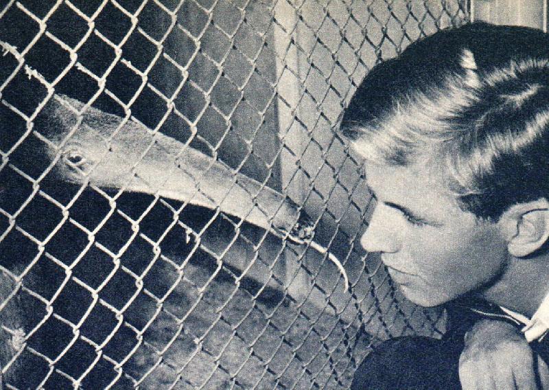 Aus einem Artikel über Ameisenbären in DAS TIER, August 1961: Sieht nach Innenaufnahme im Rundbau aus, damals also mit Maschendrahtvergitterung; man beachte den Schieber gleich hinter dem Frontgitter. Rechts im Bild dürfte Michael Grzimek sein. Der selbe Artikel enthält auch ein weiteres Foto der drei adulten Tiere im begrünten Außengehege sowie Fotos eines jungen, "verwaisten" Ameisenbären, der z.B. einmal auf dem Schoß von Hildegard Grzimek sitzt und einmal auf dem Rücken eines Boxers in einer Wohnung - das wird dann wohl Grzimeks Hündin Assi gewesen sein. (22.12.2007, 21:32)