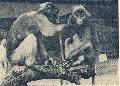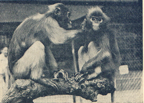 Das fragliche Bild der Brillenlanguren, die damals im Rundbau gesessen haben müssen. Die helle Fläche am oberen Bildrand ließe wie gesagt auch die Deutung zu, dass es sich um eine durchgehende Überdachung (also kein Gitter) gehandelt haben könnte. Für diese Möglichkeit spräche der zwischen den beiden Affen zu sehende Pfosten, der oben genau auf die Ecke dieser Fläche trifft, also ein Stützpfeiler eines solchen Daches gewesen sein könnte. (23.12.2007, 22:49)